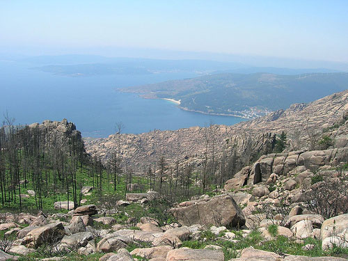 Montes famosos, montes con ascendencia e tradición, non faltan en Galicia. Así, a escolla do monte non foi doada. O monte Sacro parecía ter o nome adecuado. O Tecla tamén ofrecía moitas posibilidades. E que non dicir do Facho, sé de Laerobrigos e deidades prerromanas. Indaguei sobre varios montes pero, ao final, non vacilei en situar o meu conxunto poderoso no monte Pindo. O Pindo altivo, cíclope arrogante fronte a baía; o Pindo colosal acolledor de prodixios; oPindo pedregoso, emblema da Galicia seixal, era, pensei, o sitio idóneo para acoller a Pedra-Figueira. Desde a veciña vila de Carnota, coa raíz prerromana carn ( pedra ), ao cumio de O Pedrullo, mesmo a lingua zoaba como pedras batendo contra os náufragos da Costa da Morte cando o trebón.