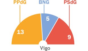 Forte ascenso do PPdeG en Vigo. Con 14 mil votos máis, Corina Porro puxo o seu partido no gume da maioría absoluta e os populares chimparon de 10 a 13 concelleiros, un menos dos necesarios para a maioría absoluta nunha corporación de 27 concelleiros.