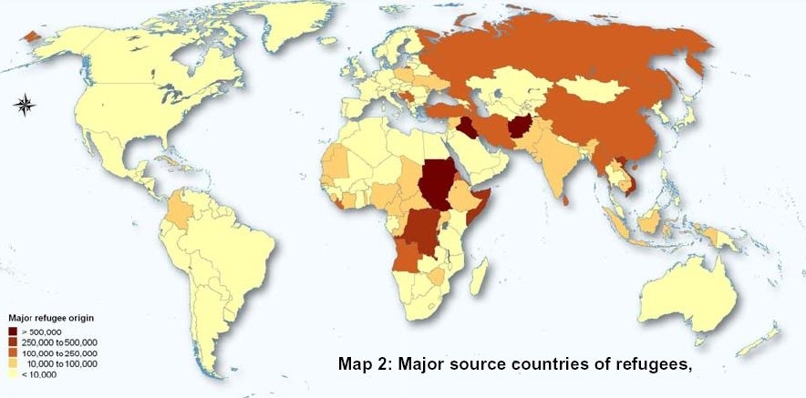 Paquistán é o país que máis refuxiados acolle (2,1 millóns), seguido por Irán. Estes dous estados reciben o 20% do total de refuxiados no mundo, observa ACNUR. Os EUA figuran en terceiro lugar, seguidos por Siria e Xordania, países que aparecen por primeira vez entre os que acollen refuxiados. Preto de medio millón de iraquís atoparon asilo nestes dous países dende a invasión estadounidense, en 2003.