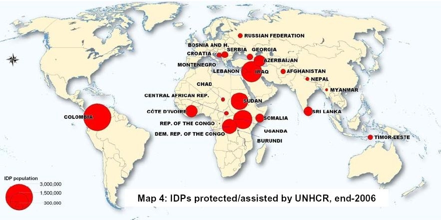 Ademais, o número de desprazados internos atendidos polo ACNUR en 2006 duplicouse con respecto ao ano anterior, cun total de 13 millóns de persoas. Centenares de miles foron desprazadas o ano pasado dentro do seu país, sobre todo en Colombia, Iraq, Líbano, Sri Lanka, Timor e Sudán. Colombia figura no primeiro lugar neste apartado, con preto de tres millóns de persoas obrigadas a deixaren os seus fogares por mor dos conflitos armados.