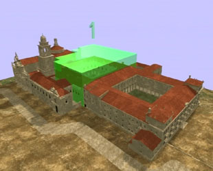 Recrea o que sería o proceso de construción do primeiro conxunto de edificacións na zona, até a posterior construción da inicial igrexa medieval, xunto coa capela de San Miguel. Por último, chega até o edificio actual reparando no mosteiro románico intermedio. Virtualmente, pode seguirse en detalle a evolución histórica desde que xurdiu a obra en paralelo ao desenvolvemento do centro urbano de Celanova até conformar a vila actual.