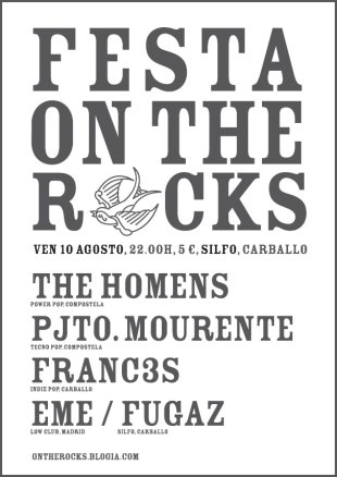 O programa de música independente na rede On The Rocks celebra o seu primeiro festival ao vivo o venres 10. A cita será en Carballo, na sala Silfo ás dez da noite por cinco euros. O espazo presentado por Pepa Arán e dirixido por Quico Balay levará até o local carballés a The Homens, Projecto Mourente e Franc3s, ademais dos picadiscos Eme e Dj Fugaz.