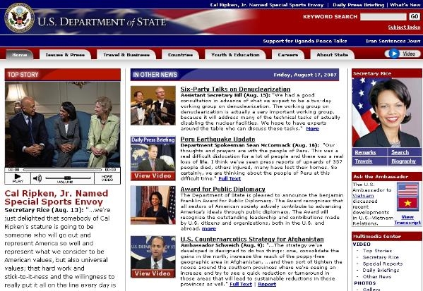 Cal Ripken Jr é unha lenda do béisbol nos EUA. O pasado luns o Ministerio de Asuntos Exteriores estadounidense (US State Department) designouno 'embaixador de Boa Vontade'. O feito en si non é unha novidade, mais si o é que o departamento que dirixe Condoleezza Rice decidise facer pública a noticia a través do YouTube, segundo recolle a axencia de noticias Associated Press para a canle de televisión americana ABC.