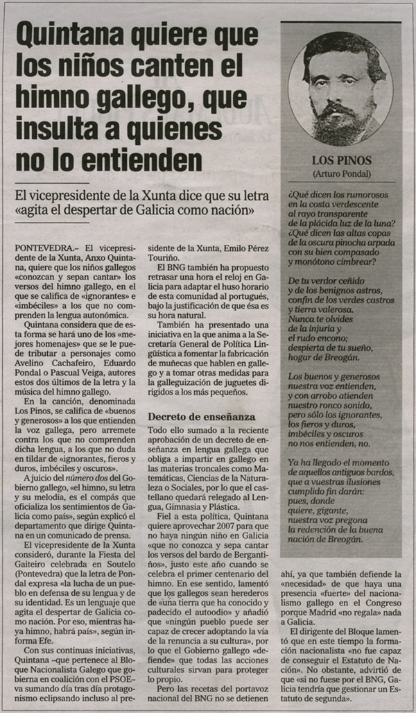 Paradoxal interpretación a que fan este luns desde as páxinas do diario madrileño El Mundo sobre o himno galego. Recuperando as declaracións realizadas polo vicepresidente da Xunta, Anxo Quintana, o pasado sábado en Soutelo de Montes, onde chamaba a que os cativos do país poidan "coñecer e cantar" os versos de Pondal, elaboran unha información co título "Quintana quere que os nenos canten o himno galego, que insulta a quen non o entende".
