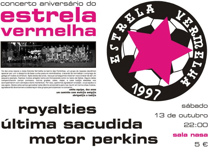 Agora celébrano cunha festa na Sala Nasa, un reduto alternativo dos poucos que quedan en Compostela á marxe da cultura institucional. Será o sábado ás 22:00 horas co directo dos Royalties, Última Sacudida e Motor Perkins. Haberá camisolas a vender conmemorando os dez anos e moitos colegas do equipo.