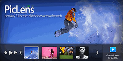 Con PicLens, a ferramenta é unha pequena frecha que aparece sobre a primeira fotografía seleccionada. E cun clic toda a serie aparece na pantalla, unha imaxe en grande e as pequenas debaixo. Piclens é un produto de CoolIris que serve para previsualizar as páxinas ás cales nos conduciría un vínculo se pulsaramos enriba. Un e outro funcionan perfectamente como extensións de Firefox. Un comentario sobre este produto pódese atopar en Interclue.