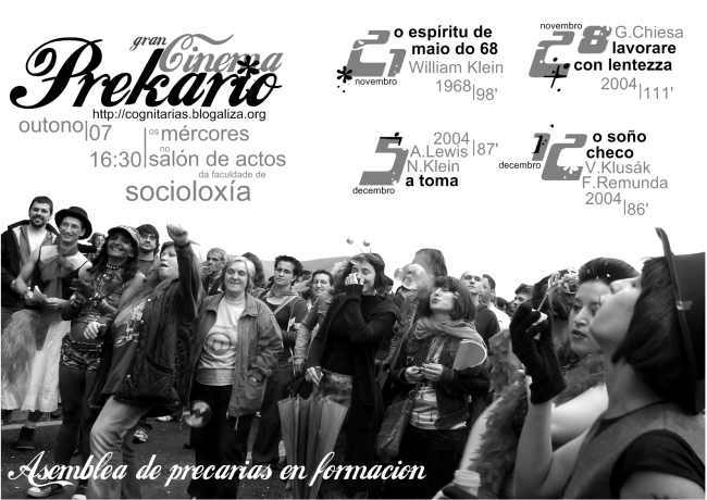 A facultade de Socioloxía da Universidade da Coruña acollerá a partir deste mércores as proxeccións organizadas pola Asemblea de Precarias en Formación. Os catro filmes teñen como protagonistas a movementos sociais en loita, en París, Italia, Arxentina e Praga. Cada proxección, que será de balde, acompañarase dunha escolma de textos sobre cada movemento.