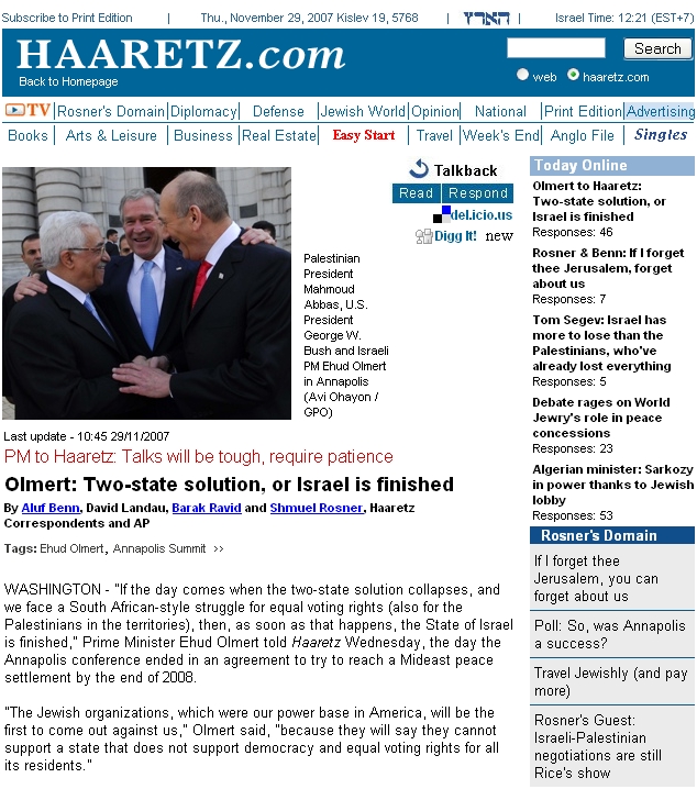 O primeiro ministro israelí, Ehud Olmert, fixo estas declaracións ao diario Haaretz a cuarta feira, logo de rematar a xornada da Conferencia de Annapolis en que se chegou a un acordo para tratar de estabelecer a paz na zona antes de 2009.