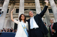 Pola súa banda, o presidente sainte Néstor Kirchner acompañou á súa muller e ao radical Julio Cobos durante todo o primeiro día na presidencia e asegurou que chega “un tempo mellor" para os arxentinos coa asunción da súa dona. "Quero mandarlles un saúdo a todos os arxentinos e dicirlles que vén un tempo mellor", afirmou Kirchner á axencia de noticias Télam mentres se dirixía desde o Salón Branco de Casa de Goberno ao despacho de Cristina Fernández. Mentres era abrazado por funcionarios e invitados, o presidente saínte expresou que sentía "unha gran emoción".