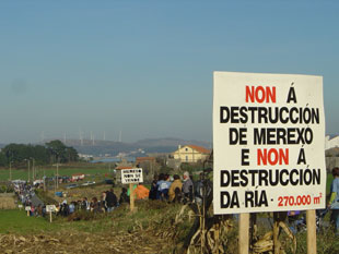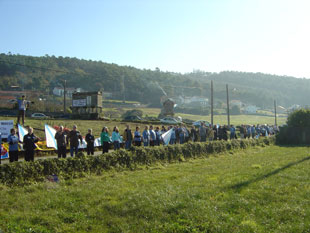 Sobre as Brañas de Merexo despregouse unha pancarta xigante ao tempo que os participantes fixeron unha cadea humana coa que lle solicitaban á Xunta "por enésima vez" que "recapacite" e evite o dano irreversíbel que suporía expropiar 270.000 metros cadrados (equivalentes a 40 campos de fútbol) de terreos de primeira calidade para darllos en concesión á empresa norueguesa Stolt Sea Farm.