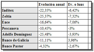 Un 6,42% caeu o valor de Inditex durante a xornada deste luns, onde a ameaza de recesión zoupou duro na evolución dos valores bolseiros en xeral e onde atopamos importantes caídas entre o capital galego. Entre os máis afectados aparecen tamén Zeltia, cun descenso medio do 7,32% e Ence, con caída dun 7,06%. Menos duro foi o impacto para as contas de Adolfo Domínguez, que pecharon o día cun 3,93% por baixo dos números da xornada anterior, ou o Banco Pastor, que perdeu un 2,67%. En parecidas cifras se moveu Pescanova, un 3% menos que ao abrir a bolsa, e o Banco de Galicia foi o único que non descendeu, manténdose un 3,96% por riba. O menor impacto foi para Unión Fenosa, que pechou o día cun 1,65% de descenso.