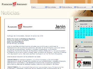 Ante os terribles acontecementos actuais que contribúen a prolongar a desesperación da poboación palestina, profundar no sufrimento, provocar danos con graves consecuencias, feridas e mortes innecesarias, a Fundación Araguaney-Ponte de Culturas, a Asociación Galaico-Árabe Jenin e os que subscriben o presente documento piden a Israel o cesamento da actitude de bloqueo e renovar o diálogo e a negociación como vías para pacificar a situación nos Territorios Ocupados.