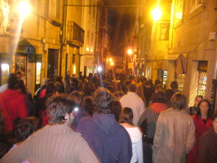 Ao redor de trescentos estudantes responderon ao chamamento que o venres ao mediodía fixeran varias organizacións para protestar polas detencións de Serxio Piñeiro e Iago Barros. A concentración partiu da praza de Cervantes e encamiñouse ás dependencias da policía nacional en Compostela, onde se despregaron dúas faixas nas que se podía ler "non á criminalización do estudantado" e "stop represión contra o estudantado". Tamén repetiron berros pedindo a liberdade dos detidos, e criticando a actuación policial e do reitorado da USC. A presenza dos medios de comunicación era moi numerosa, con media ducia de cámaras de televisión que gravaron a manifestación ao completo.