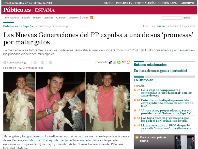 Un dos integrantes da listaxe do PP nas pasadas Municipais en Talavera de la Reina (Toledo), Jaime Ferrero, foi fotografado varias veces esfolando gatos na rúa, e após coñecerse a súa "afección", foi expulsado das Novas Xeracións do partido na provincia de Toledo.