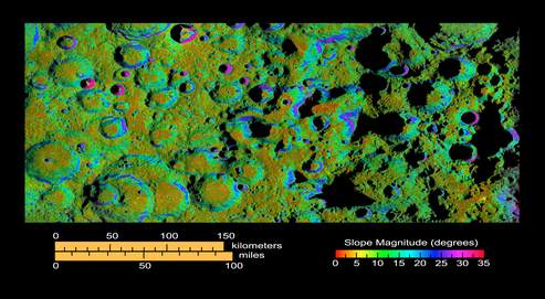 Esta imaxe do Polo Sur da Lúa tomada pola NASA co potente radar Goldstone (California) é a máis precisa obtida ata o de agora. Revela unha paisaxe máis accidentada do que imaxinaban os expertos, con cumios superiores a 6.000 metros e cráteres que poden acadar unha profundidade de 4.000 metros.