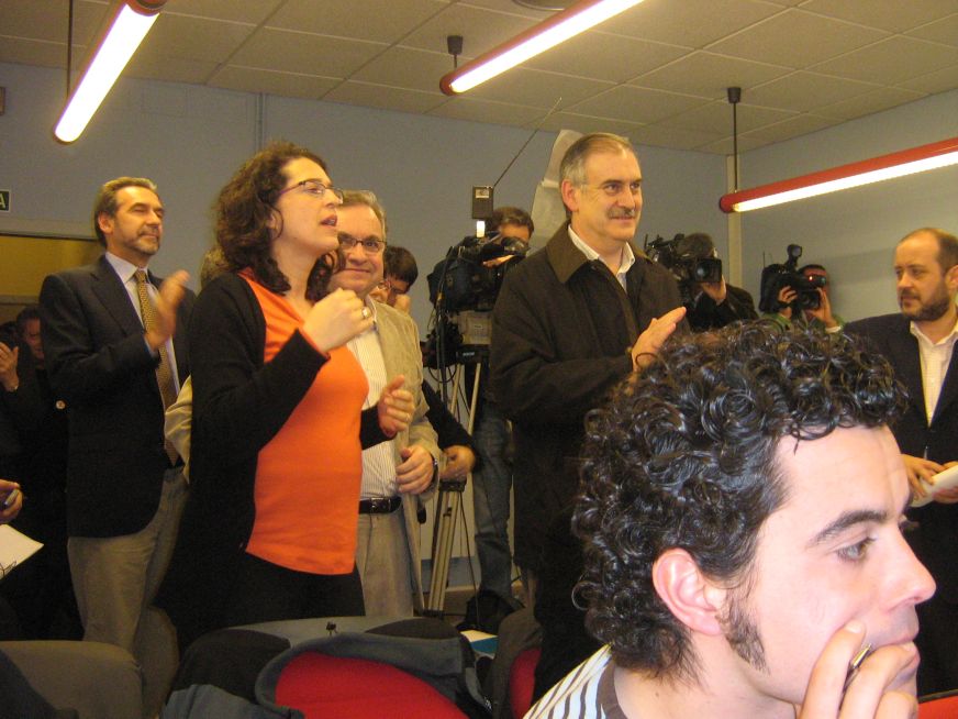 Óense risos dende o cuarto do lado, a sala da organización, onde arestora están reunidos os militantes socialistas. Os compañeiros da prensa seguen a facer conxeturas (hai quen apostou unha cea a que Rosa Díez non entraba no Congreso... e perdeuna), mais tamén na prensa parecen todos encantados cos primeiros resultados. Cando saen no televisor membros do PP dicindo que aínda non está nada dito, e que todo pode variar aínda moito, a xente ri.