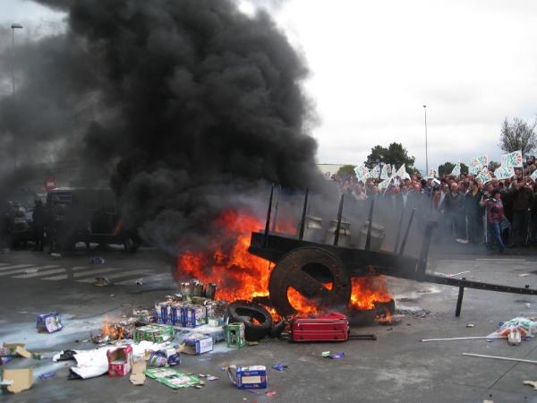 Os manifestantes, convocados por Unións Agrarias, ergueron barricadas na entrada do polígono do Ceao. A policía cargou contra parte dos concentrados.
