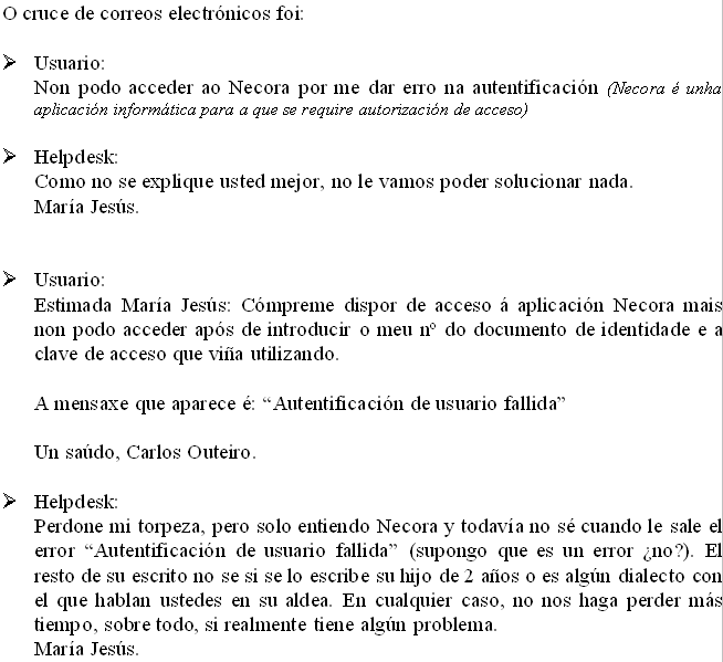 "Perdone mi torpeza, pero solo entiendo Necora y todavía no sé cuando le sale el error 'Autentificación de usuario fallida' (supongo que es un error ¿no?). El resto de su escrito no se si se lo escribe su hijo de 2 años o es algún dialecto con el que hablan ustedes en su aldea. En cualquier caso, no nos haga perder más tiempo, sobre todo, si realmente tiene algún problema"