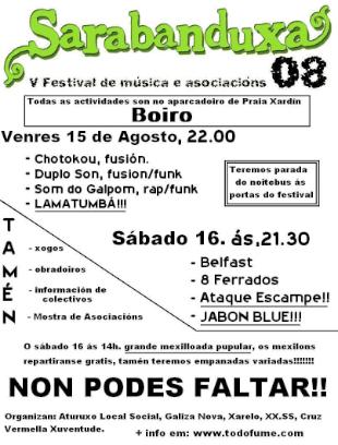 Un ano máis volta o Sarabanduxa, o Festival de música e asociacións de Boiro. E xa van cinco anos que os colectivos e asociacións do concello de Boiro conseguen sacar adiante conxuntamente un festival para a mocidade da vila.