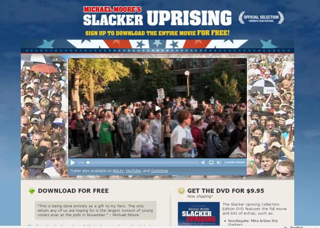 O filme, titulado Slacker Uprising, supón a entrada directa de Moore na campaña electoral, xa que con este traballo pretende instar aos mozos estadounidenses a votar nas eleccións presidenciais de novembro, preferentemente aos demócratas. Ademais, é a primeira vez que Michael Moore emprega a rede para distribuír o seu traballo; segundo el a idea era facerlle "un agasallo aos meus admiradores".