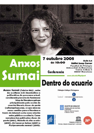 A sección de Filoloxías Galega e Portuguesa da Facultade de Filoloxía da Universitat de Barcelona presenta a conferencia de Anxos Sumai "Dentro do Acuario".