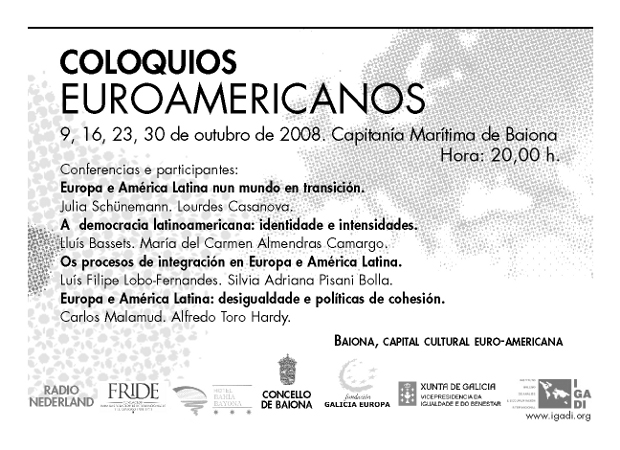 O IGADI organiza durante o mes de outubro en Baiona os Coloquios euroamericanos, que contarán coa participación de diplomáticos, xornalistas, académicos e analistas. Dende o día 9, na Capitanía Maritima, cada xoves reflexionarase sobre os grandes temas que achegan e afastan América e Europa.