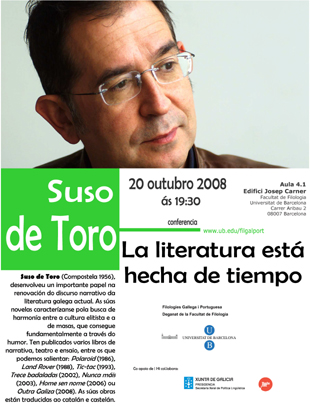 Suso de Toro (Compostela 1956), desenvolveu un importante papel na renovación do discurso narrativo da literatura galega actual. As súas novelas caracterízanse pola busca de harmonía entre a cultura de elite e a de masas, que consegue fundamentalmente a través do humor. Ten publicados varios libros de narrativa, teatro e ensaio, entre os que podemos salientar: Polaroid (1986), Land Rover (1988), Tic-tac (1993), Trece badaladas (2002), Nunca máis (2003), Home sen nome (2006) ou Outra Galiza (2008). As súas obras están traducidas ao catalán e castelán.