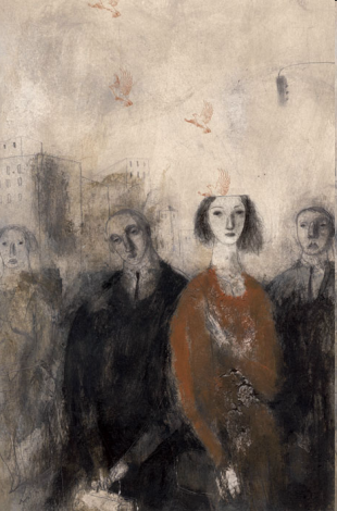 Son unhas ilustracións extraordinarias, e o libro gaña moitísimo con elas. É un autor magnífico, que se move con grande xenio tamén no cómic. O propio universo de Audell conecta moito coa pegada dos contos e el sentiuse motivado co proxecto. Recordo quedar abraiado cando vin a primeira mostra do seu traballo para o libro. A propia portada é tomada dunha das referencias cinematográficas utilizadas no libro, O ceo sobre Berlín, de Wim Wenders.