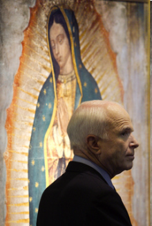 19h35: Se antes lles contabamos que parentes e seareiros kenyatas de Obama lle pegan duro ao rezo a prol do senador, agora amosámoslles a estampiña de John McCain coa Virxe de Guadalupe. Repártenas activistas hispanos do Partido Republicano no estado de Nevada. Na beira de atrás levan unha pregaria especial que pide pola vitoria de McCain.