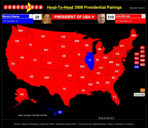 : O segundo mapa no Daily Kos. Hai un par de anos unha sondaxe incluía entre as variábeis analizadas a hipótese de que os candidatos presidenciais foran Barack Obama e John McCain. Preguntáronlle a 30 mil cidadáns, 600 por estado, a quen votarían. O resultado é o mapa seguinte: Obama só era apoiado no estado onde vive, Illinois; no de nacemento, Hawaii; e no de Columbia.