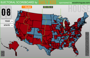 19h25: O Daily Kos, unha das bitácoras de referencia da beira demócrata, publica un par de mapas que vos convidamos a mirar. O primeiro "Azul a través de América", especula se sería posíbel cruzar os Estados Unidos dun extremo ao outro sen pasar por solo de maioría republicana.