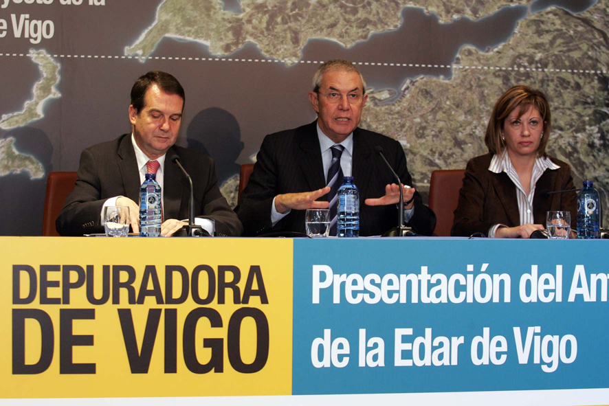Durante o acto de presentación do anteproxecto da EDAR, Abel Caballero, Emilio Pérez Touriño e Elena Espinosa