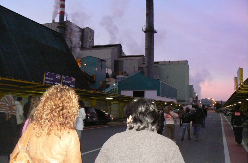 Os 'piquetes', a primeira horas da mañá, impedindo a entrada de traballadores da limpeza ás instalacións de Ence, en Pontevedra / Imaxe: CIG