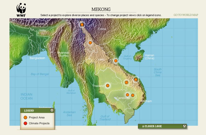 Debido ás circunstancias xeopolíticas -primeiro o colonialismo e despois varias guerras-, a rexión que arrodea o río Mekong é unha das máis ricas en biodiversidade e tamén das máis descoñecidas do mundo en termos biolóxicos. O Mekong nace no Tíbet e desemboca no mar da China, atravesando 4.500 quilómetros. A WWF traballa en tres rexións que forman o que denominaron Greater Mekong e que abranguen partes de Camboia, Laos, Birmania, Tailandia, Vietnam e o Yunnan, unha das provincias da China.