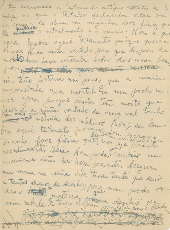 Nese momento, Castelao deixa de escribir e o manuscrito continúa con letra de Rodolfo Prada, que transcribe o que Castelao lle dita, manifestando a súa esperanza no futuro, esixindo para Galiza unha 'autonomía integral dentro dunha Confederación Hispana' e despedíndose "dende o meu leito de enfermo" de todos os patriotas galegos: "Por riba da desagradable crónica e da dura crítica que eu podía facer hoxe da aitualidade, queda, non embargantes, a miña espranza no bó sentido galego, e quero deixar testimoño no tempo dos nosos ideaes, que non se limitan ao conquerimento d-un simple Estatuto otorgado graciosamente polo Estado Hepañol, senon d-unha Autonomía integral para Galiza dentro d-unha Confederación Hispana. Dende o meu leito de enfermo envío, n-iste día memorable, afervoados saúdos a tudol-os patriotas galegos.
