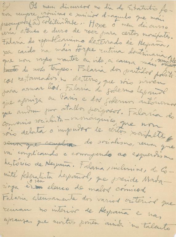 O texto continúa repasando a actualidade política do exilio: "Os meus discursos no día do Estatuto foron sempre crónicas e xuicios d-aquelo que máis preocupaba á nosa coleitividade. Hoxe o meu discurso sería extenso, e duro de roer para certos monifates. Falaría do republicanismo desterrado de Hespaña, xa caído na máis torpe rutina doutrinaria, que non soupo manter en vilo, a causa máis sensible do noso tempo. Falaría dos partidos políticos restaurados no desterro, que sóio sirven para armar líos. Falaría do goberno hespañol que agoniza en París e dos gobernos autónomos que andan por atallos perigosos. Falaría do convenio socialista-monárquico, que non sóio delata o impudor de certos xerifaltes do socialismo, senón que vai complicando e corrompendo ao esquerdismo hestórico de Hespaña. Falaría, inclusive, do Comité Federalista Hespañol, que preside Madariaga e o seu elenco de malos cómicos. Falaría extensamente dos varios criterios que reinan no interior de Hespaña e nas espranzas que moitos poñen ainda no talento de Prieto".