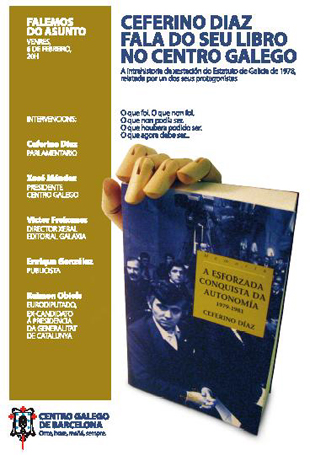 Coa presenza do autor: Ceferino Díaz , parlamentario, e a intervención de Xosé Méndez, presidente do Centro Galego de Barcelona, Victor Freixanes, Director Xeral da Editorial Galaxia, Enrique González, publicista, e Raimon Obiols, eurodeputado, ex candidato á presidencia da Generalitat de Catalunya