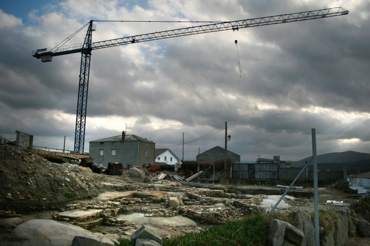 As obras non están paralizadas, e a empresa aproveita para ir construíndo os tres edificios dun cento de vivendas que ten proxectados, sobre o xacemento.