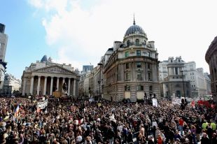"Estas rúas, as nosas rúas! Estes bancos, os nosos bancos!", berraron os manifestantes, que ademais racharon as fiestras dunha sucursal do Royal Bank of Scotland, un banco que tivo que ser rescatado polo Goberno. A Policía desenvolveu unhas das maiores operacións de seguridade do país para protexer as empresas, o Banco de Inglaterra, a Bolsa e outras institucións financeiras. Houbo unha vintena de detidos.