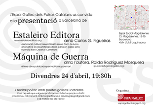 Co seu desembarco en Barcelona, Estaleiro Editora pretende cumprir un dos seus obxectivos fundacionais: exportar o seu proxecto de edición independente, alternativa e vinculada á libre difusión cultural, nun conxunto amplo e diverso de espazos. O 22 de abril, o portavoz da editora Carlos G. Figueiras compartirá mesa con Raida Rodríguez Mosquera na Facultat de Lletres da Universitat Autònoma, nun acto organizado polo Lectorado de Galego da devandita universidade. Dous días despois, o 24 de abril, Estaleiro levará o seu proxecto ao Espai Social Magdalenes, onde a presentación de Máquina de guerra dará paso a un recital galego-catalán aberto ás persoas interesadas. Este segundo acto está organizado polo Espai Gallec dels Països Catalans. O último evento desta intensa axenda terá lugar ao día seguinte no Centro Galego de Barcelona, entidade histórica do asociacionismo galego na cidade que, con iniciativas coma esta, demostra a súa vontade de se abrir ás propostas máis innovadoras da nosa cultura.