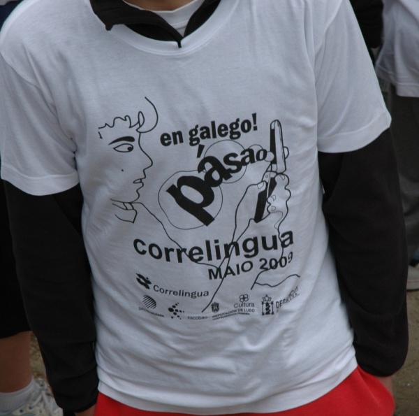 Compostela encheuse este xoves de mozos, mozas, nenas e nenos que se xuntaron para reivindicar no medio dun ambiente xovial e usando como medio a festa rachada o seu dereito a medrar en galego. Máis de 4.500 mozos e mozas chegados de concellos pertencentes ás comarcas colindantes participaron no Correlingua´09, xornada que tivo carreiras, concertos, humor e, sobre todo, moita troula baixo o lema En Galego! Pásao.