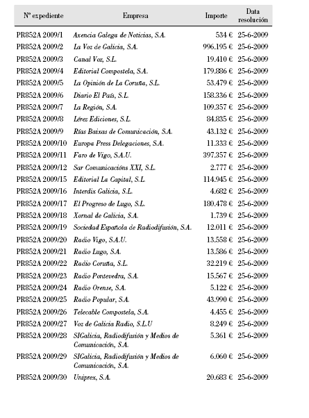 O Diario Oficial de Galicia fai pública este venres a resolución, con data de 25 de xuño, da Secretaría Xeral de Medios, que lle dá publicidade aos beneficiarios das axudas concedidas a empresas xornalísticas e de radiodifusión. Unha convocatoria que lle toca resolver ao equipo de Alberto Núñez Feijoo pero cuxa convocatoria fora aberta xa na altura de novembro de 2008 .