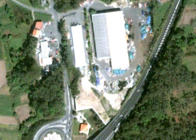 Na foto, de Google Maps, pódense ver as redes amoreadas fóra da nave, antes do lume, ao carón da autovía