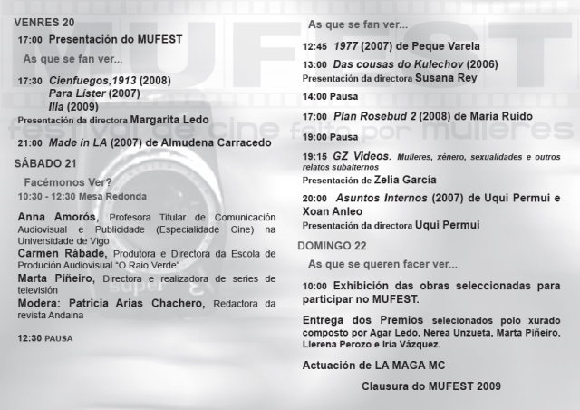 É por isto que a Asociación Andaina Mulleres, "aproveitando o pulo que lle dá a oferta cinematográfica Cineuropa (o festival de cine que se está a desenvolver estes días en Compostela)", organizan o MUFEST, o I Festival de Cine feito por Mulleres, que se celebrará no Auditorio de Galicia, na capital galega, os dias 20, 21 e 22 de novembro. O certame conta coa colaboración da Concellaría de Benestar Social e Igualdade de Santiago.