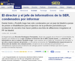 Por este motivo, o xuíz condena o director da SER, Daniel Anido, e o director de informativos da mesma emisora, Rodolfo Irago, por "revelación de secretos", fixa para eles un ano e nove meses de prisión, estabelece unha multa de 18 mil euros, esixe o pago dunha indemnización de 130 mil euros e decreta a inhabilitación de ambos os dous para asumiren a dirección de medios ou o propio exercicio da profesión xornalística.