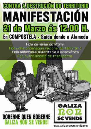 Pola defensa do litoral, por unha ordenación racional do territorio, pola soberanía alimentaria e enerxética e por outro modelo de transporte. Catro das razóns fundamentais a prol das cales a plataforma Galiza Non se Vende convoca a cidadanía a manifestarse este domingo na capital do país.