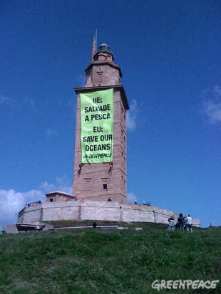 Os ambientalistas achegáronse a primeira hora deste luns á Torre de Hércules onde seis activistas despregaron unha pancarta con varios levas: "Salvade a pesca" e "Salvade os nosos océanos". O obxectivo é que os ministros de Pesca europeos se comprometan a acordos concretas a prol do futuro dos océanos e da pesca. A acción coincide coa xuntanza de expertos organizada pola Comisión Europea na cidade herculina e na véspera da xuntanza dos propios ministros en Vigo onde debaterán a reforma da Política Pesqueira Común. "A xestión que até o de agora realizou a UE neste ámbito é nefasta", denuncia Greenpeace. "Até o de agora as anteriores Políticas Pesqueiras Comúns non cumpriron os obxectivos, e as pesqueirías tradicionais teñen unha última oportunidade con esta reforma", advirten.