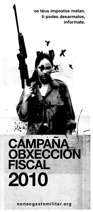 O Espazo Aberto Antimilitar continúa coa campaña pola Obxección Fiscal aos Gastos Militares (OFGM), que este se desenvolve baixo o lema Os teus impostos matan, ti podes desarmalos. Lembramos que segundo os datos de 2009, catro persoas obxectaron en Galiza aos gastos militares dun total de 875 en todo o Estado.