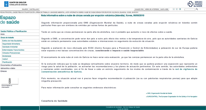 A Xunta difundiu un comunicado en que especifica que na situación actual non cómpre realizar recomendación ningunha á poboación, teñan ou non patoloxías respiratorias previas, para que adopten precaucións xa que non existe risco para a saúde das persoas.