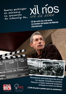 E para ese proxecto, Xil Ríos busca a participación da xente. Xa que logo, a gravación será este martes 22 de xuño a partir das 16horas, no lugar de Mañufe, en Gondomar. O único requirimento é vestir ao xeito dos anos 30, xa que o clip audiovisual recreará unha festa típica daqueles anos, inspirándose en "aquelas marabillosas orquestras e combos". "Haberá café de pote e pastas para todos os asistentes", prometen.